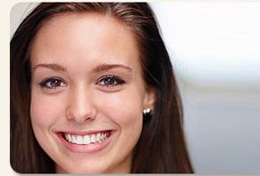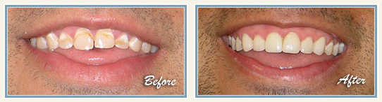 Patient with moderate fluorosis. Front six teeth were treated with cosmetic veneers to cover fluoride staining.