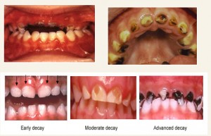 Early childhood caries, also known as nursing bottle caries, is a very common bacterial infection characterised by cavities that most often show up on a child’s upper front teeth but can also affect other teeth. It first shows up as white spots near the gum line. These spots are hard to see at first, but if caught early can be stopped from progressing into cavities. As it gets worse, they can look like brown spots, holes or broken teeth which will require more involved procedures to fix. It is very important to get treatment early to stop the decay from getting worse.